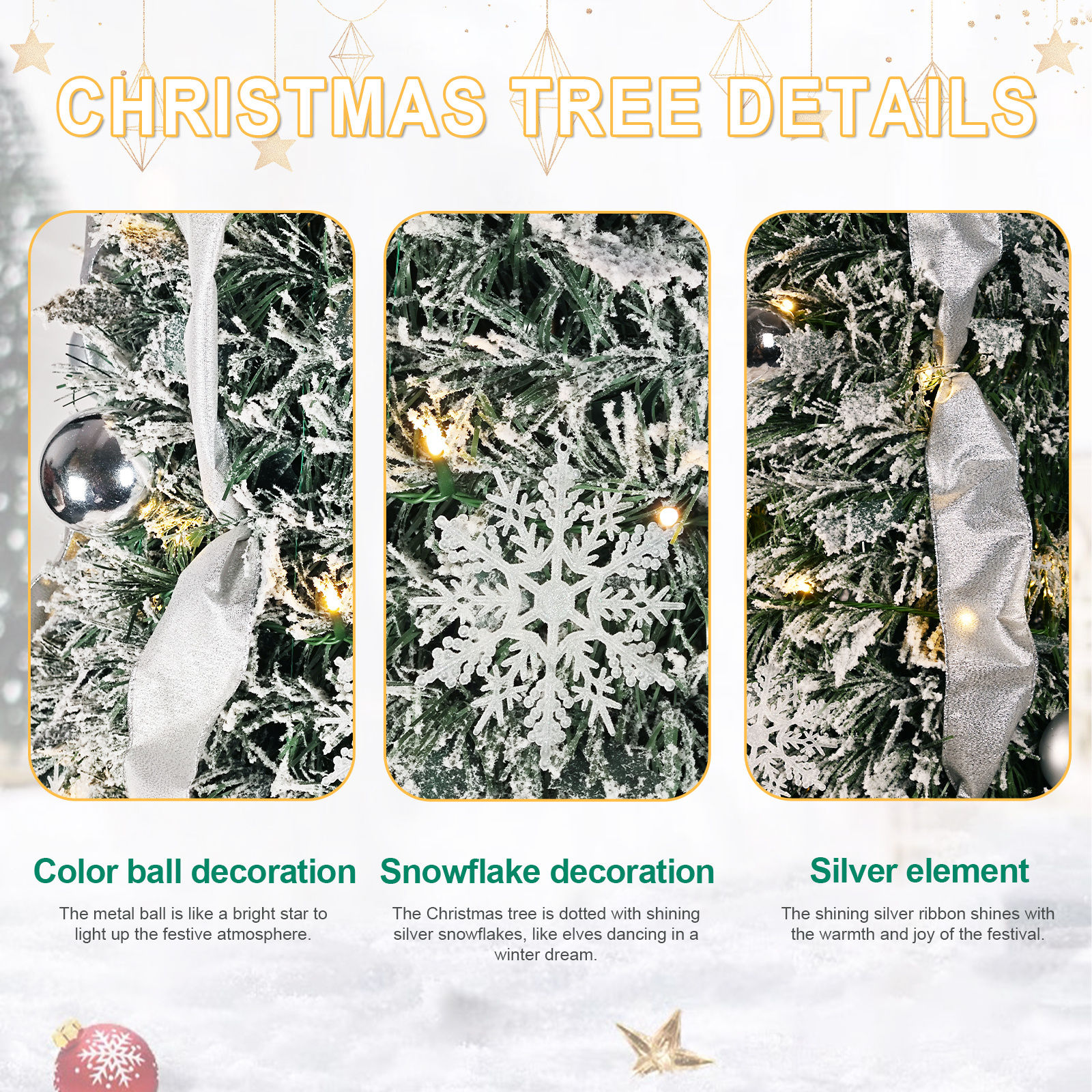 6ft pop up tree Balls: 36 pcs (18 matte, 18 silver) ribbon: 6 large bow: 1 snowflake: 18